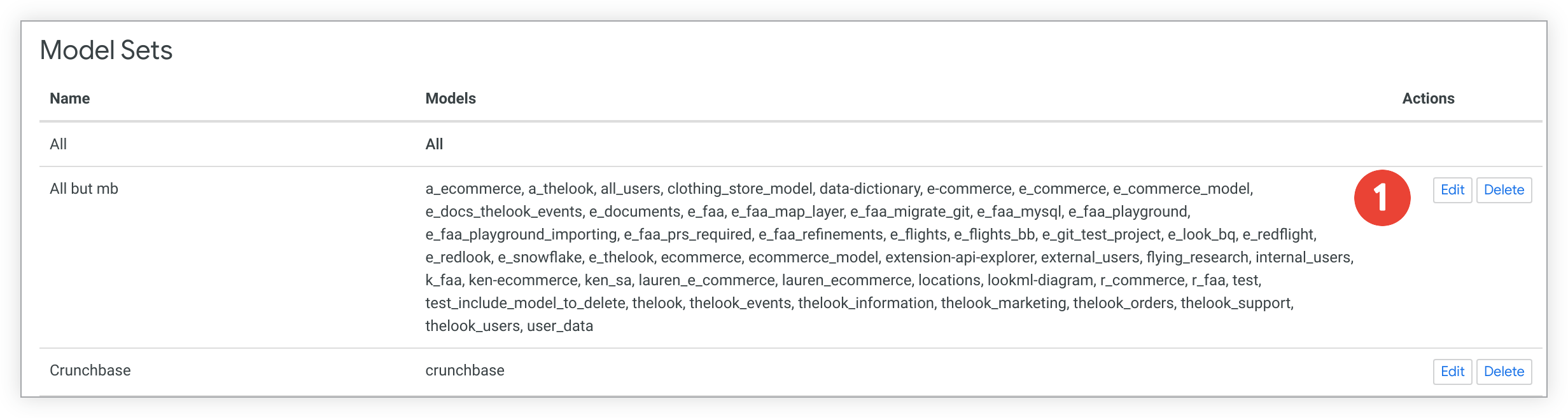 Deleting or renaming a model will not change any model sets that include that model. When a model is removed or renamed, we recommend that Looker admins also remove that model's name from any associated model sets, using the Edit Model Set page. Removing a deleted model's name from a model set prevents a new model with the same name from unintentionally being included in that model set.