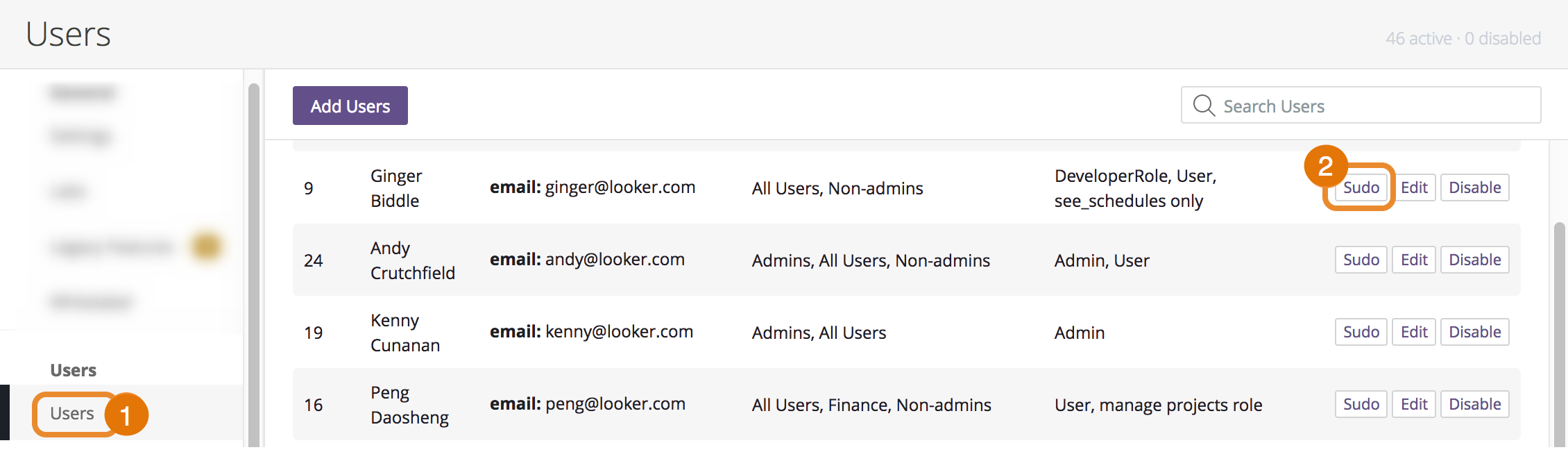 2. Select the Sudo button to the right of the user's information to impersonate the user.
