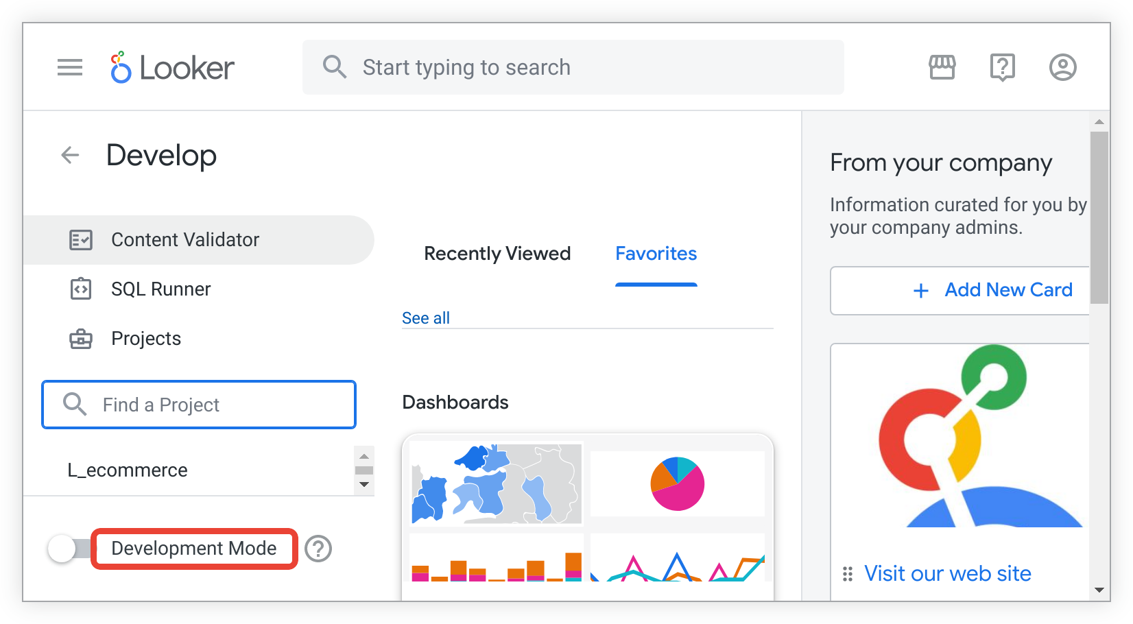 • The LookML and Explore sections of Looker are populated by your development version of the model.