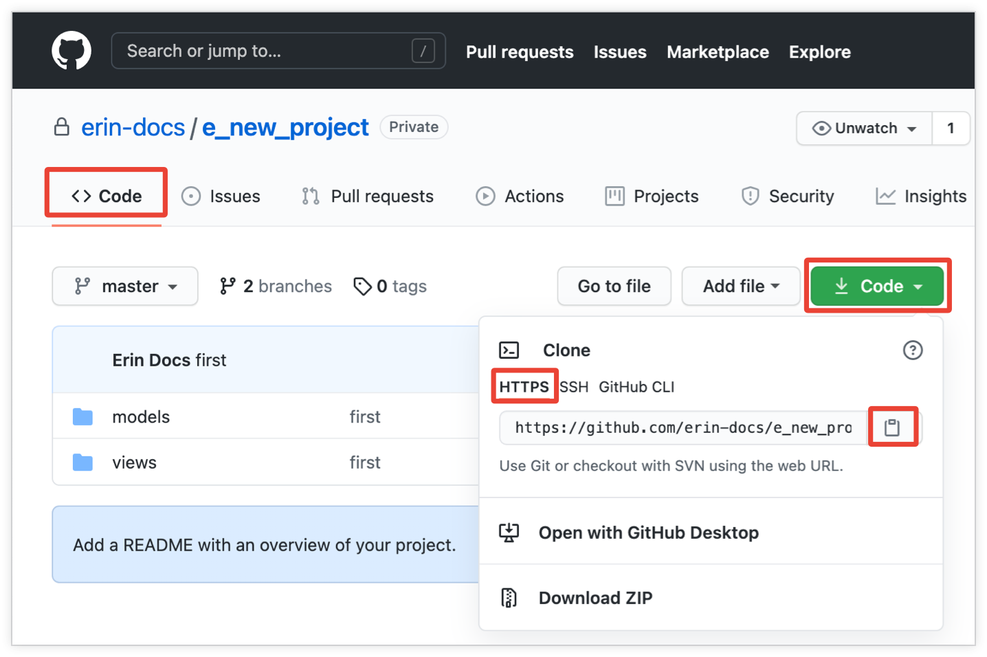 Pour les dépôts GitHub existants (ceux qui contiennent déjà des fichiers), vous pouvez afficher l'URL HTTPS en accédant à l'onglet Code du dépôt et en sélectionnant le bouton Code. Veillez à sélectionner le lien HTTPS. Vous pouvez sélectionner l'icône Copier l'URL dans le presse-papiers pour copier l'URL HTTPS dans le presse-papiers.