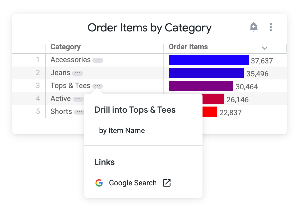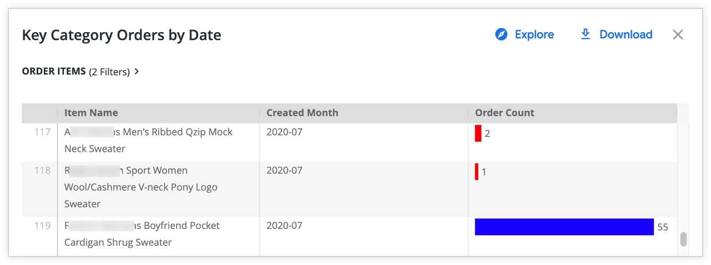 For example, consider a tile with an Order Count measure, grouped by a Clothing type dimension and pivoted on an Order Created date dimension. Say that you want to know more about sweater orders in July. You click on the sweaters bar in the July stack, and Looker displays a drill menu for sweater orders in July.