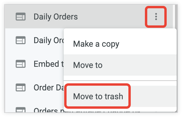 - Move to Trash: Delete the Look or dashboard from your folder. For more information, see the Organizing and managing access to content documentation page.