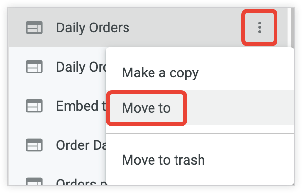 Navigate to the folder that contains the dashboard or Look that you want to copy, and then click the three-dot menu next to the content and select Move to.
